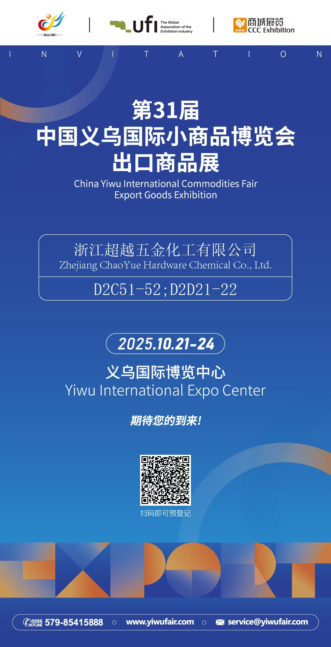 Chaoyue يدعو بحرارة المتخصصين في الصناعة والشركاء المحتملين لزيارة جناحهم في معرض الصين ييوو الدولي الحادي والثلاثين للسلع.